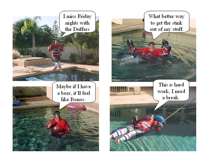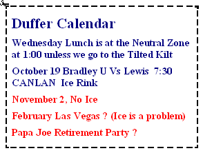 Do you know any Duffers who want to play hockey on Friday nights? We reached a new low in attendance. We had only 2 guys on each bench! We need 2 lines to have a good game and 3 lines is even better. That way you can skate hard for 90 seconds then get off and catch your breath for a few minutes. We will be playing 3 on 3 games soon if we can't find some guys that want to play.